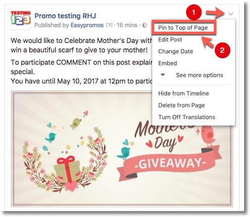 When you’ve published your giveaway post, make sure you pin it to the top of the page as we show in the following screenshot. Leave it pinned while the promotion is active so that the users that visit your Facebook page can see the giveaway as the very first post.