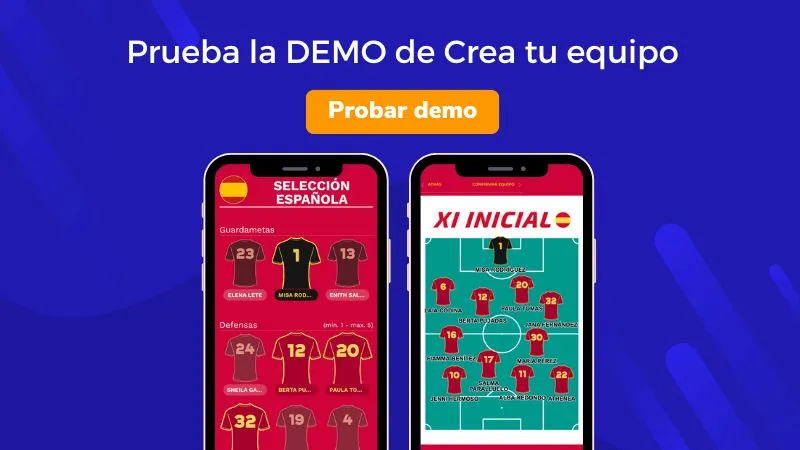 - Propón a los aficionados que se pongan en la piel del entrenador y configuren el once inicial del partido. Incentiva la participación con un buen premio a sortear entre todos los acertantes. Utiliza la aplicación Crea tu equipo y diseña un terreno de juego donde los participantes podrán poner las caras o camisetas de los jugadores. Además, la imagen resultante podrá ser descargada y compartida entre los usuarios, como puedes ver en el siguiente ejemplo.
