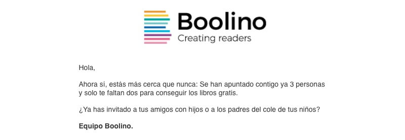 3. Plataforma de Emails: Boolino también se apoyó en la Plataforma de Emails para motivar a los participantes y lograr que cumplieran el objetivo de 5 usuarios reclutados, todo con mensajes muy bien trabajados.