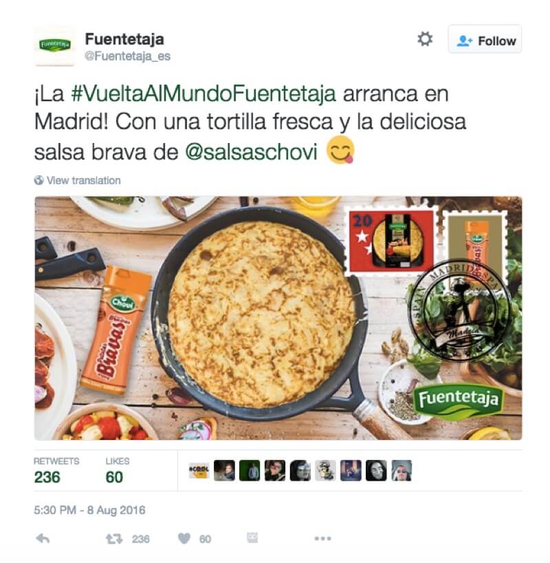 El sorteo co-branfing, que duró 12 días en Facebook y 7 días en Twitter, proponía un viaje a los seguidores de las dos marcas. Mediante creatividades en las que se combinaban uno de los productos emblemáticos de Fuentetaja (tortilla de patatas fresca) con las diferentes salsas de Choví, recreaban 7 ubicaciones distintas para ofrecer pistas del recorrido o ruta que tendrían que averiguar los usuarios. Aquellos que respondieran correctamente, entrarían en el sorteo de Facebook de 1 de los 4 fantásticos lotes de productos Fuentetaja y Choví. Utilizaron la app de sorteos en Facebook para escoger los ganadores.